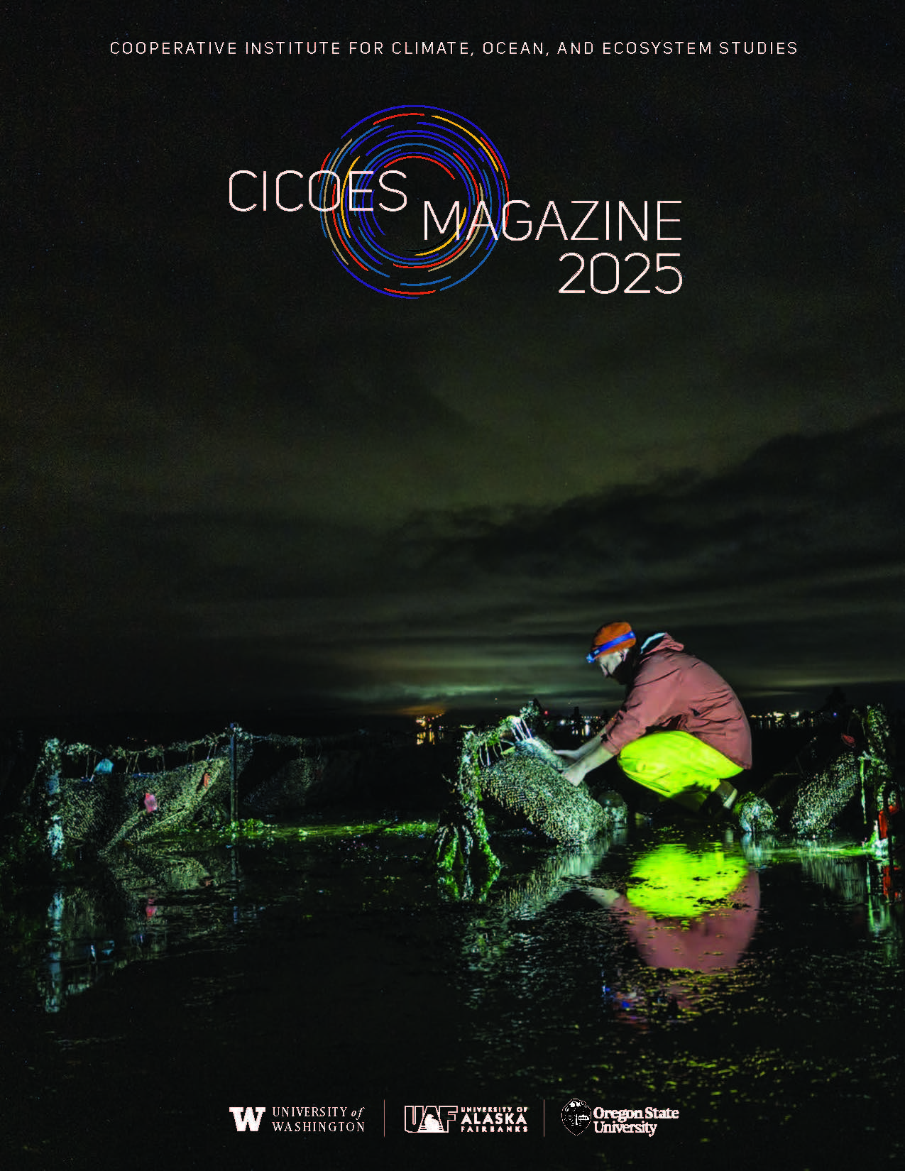 The CICOES Magazine offers an annual snapshot of the innovation, collaboration, and impact that define our research community. Drawing from across the Cooperative Institute’s three academic partners—the University of Washington, the University of Alaska Fairbanks, and Oregon State University’s College of Earth, Ocean, and Atmospheric Sciences—the magazine features stories that reflect the breadth and depth of research conducted in close partnership with NOAA. Together, these pieces highlight how collaborative science advances understanding of the climate, global oceans, and related ecosystems while informing real-world decisions.