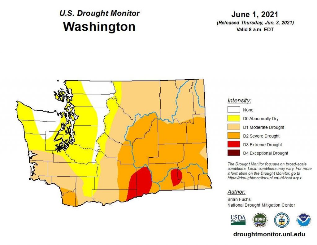 Drought conditions have spread in Washington, the U.S. Drought Monitor reported Thursday, with one-third of the state suffering “severe drought” and forecasts predicting that a hot, early summer will follow the extraordinary dry spring.