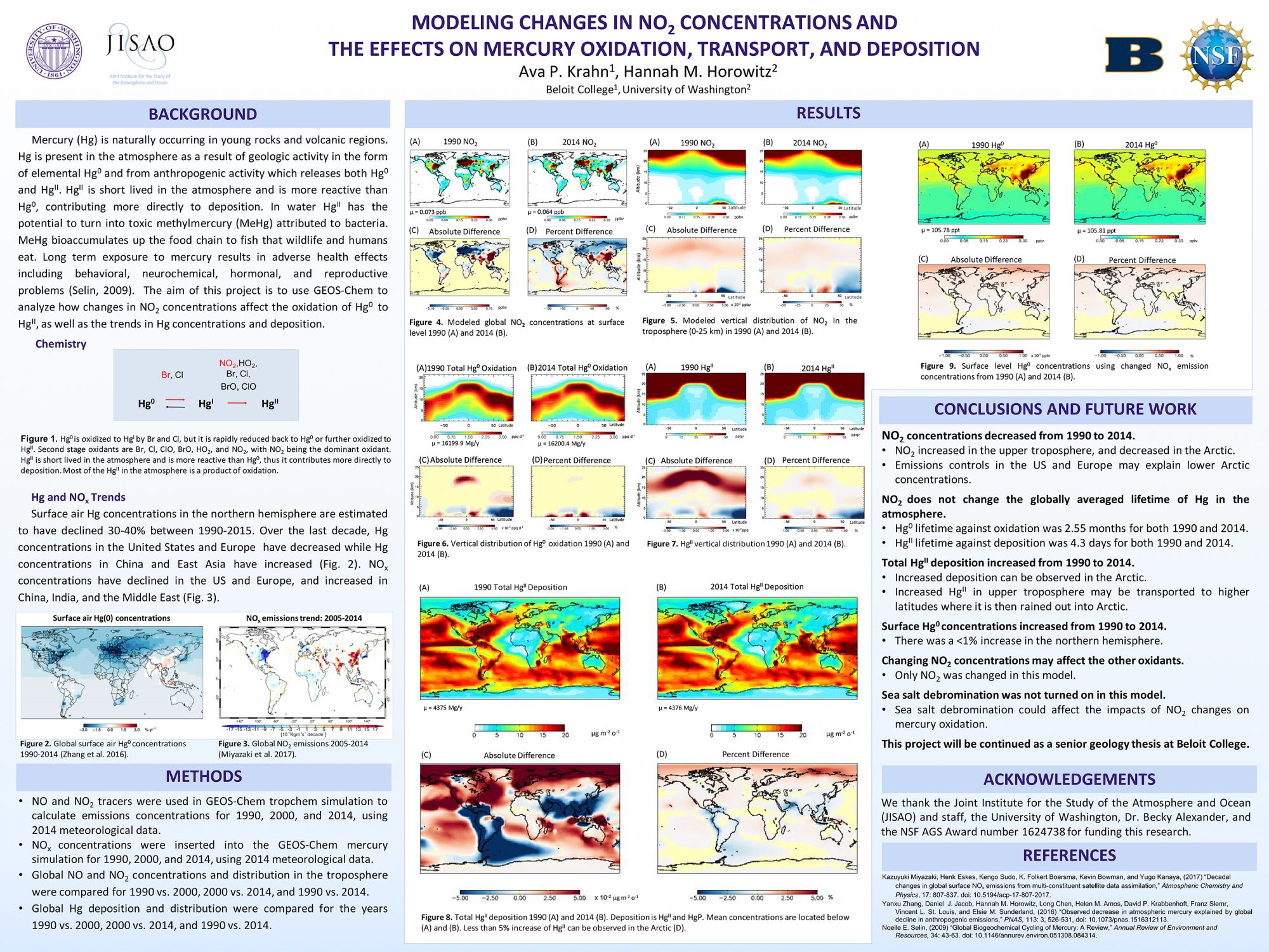 Since the 1990s there has been a flat or increasing trend in the total global Hg emissions to the atmosphere. In the United States and Europe Hg emissions have decreased while in China and East Asia, they have increased. Additionally, NOx emissions have decreased due to strict emission controls and technology improvements. Decreases in NO2 could have potential to affect the deposition rates of mercury due to potential changes in the oxidation of HgII. The aim of my JISAO project was to use GEOS-Chem to analyze how changes in NO2 concentrations affects the oxidation of mercury, as well as the trends in Hg concentrations and deposition.