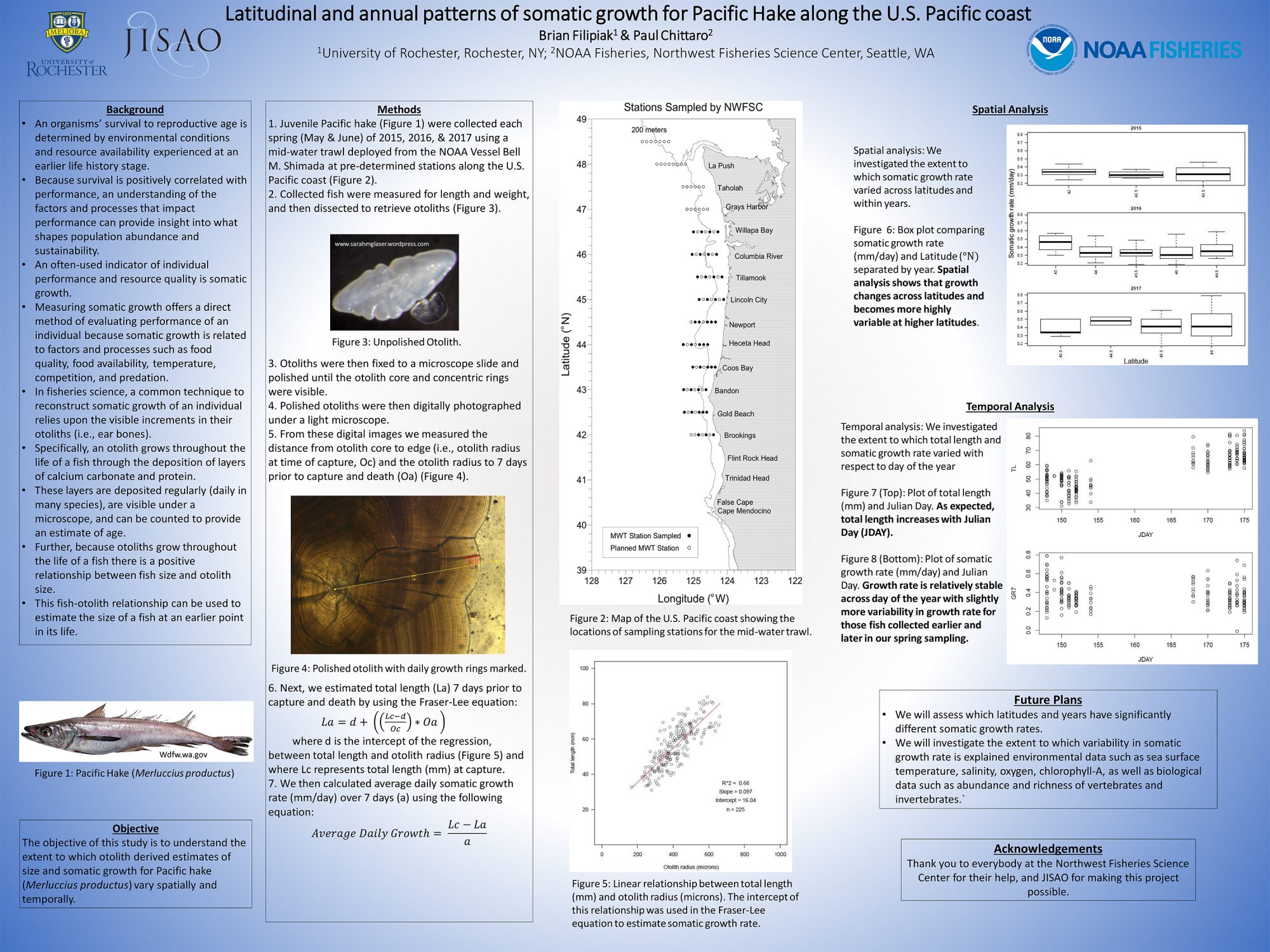 This summer, I worked at the Northwest Fisheries Science Center with Paul Chittaro. My main project this summer was looking at the latitudinal and annual patterns of somatic growth for Pacific Hake along the U.S. Pacific Coast. Pacific Hake is an important forage fish as well as being valuable in commercial fishing. They were collected over three years at different latitudes along the Pacific Coast.