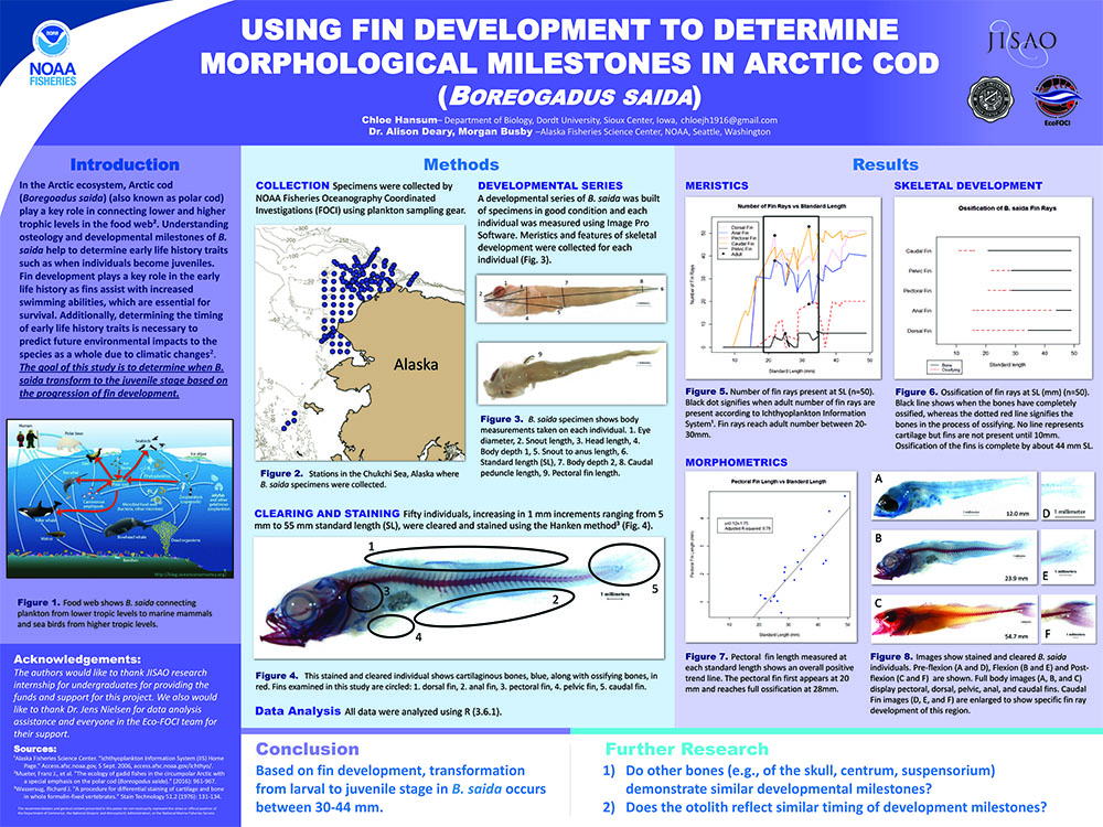 Hi, my name is Chloe Hansum and I am studying Biology and Environmental Science at Dordt University in Sioux Center, Iowa. This summer I was privileged to work with Dr. Alison Deary at the NOAA Alaska Fisheries Science Center. I worked in the Ecosystems & Fisheries-Oceanography Coordinated Investigations Laboratory (Eco-FOCI), looking at Arctic Cod (Boreogadus saida) development and identifying developmental milestones. Over the summer, I learned a great deal not only about research but also information about graduate school and career advice.