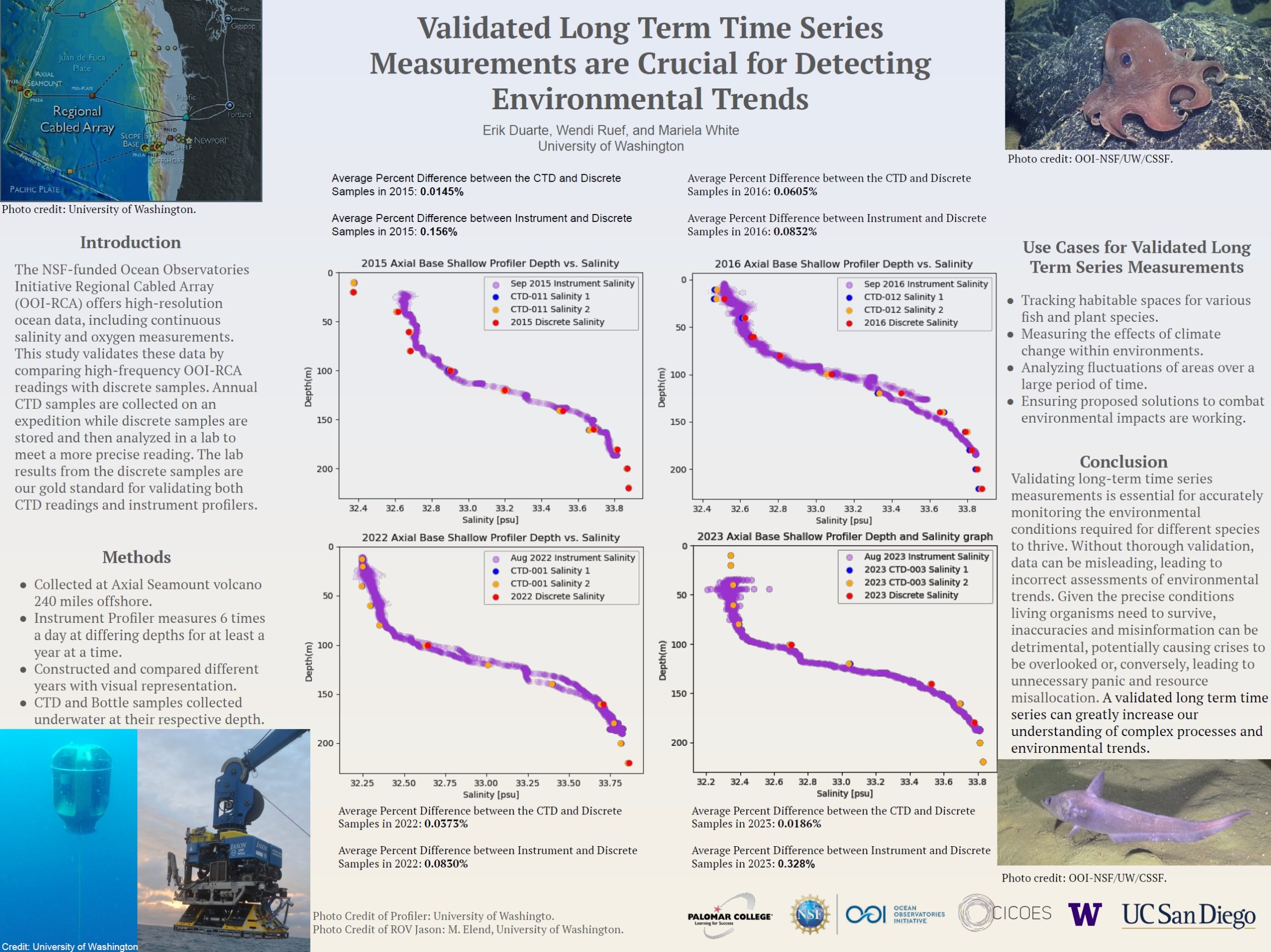 The NSF-funded Ocean Observatories Initiative Regional Cabled Array (OOI-RCA) offers high-resolution ocean data, including continuous salinity and oxygen measurements. This study validates these data by comparing high-frequency OOI-RCA readings with discrete samples. Annual CTD samples are collected on an expedition while discrete samples are stored and then analyzed in a lab to meet a more precise reading. The lab results from the discrete samples are our gold standard for validating both CTD readings and instrument profilers.