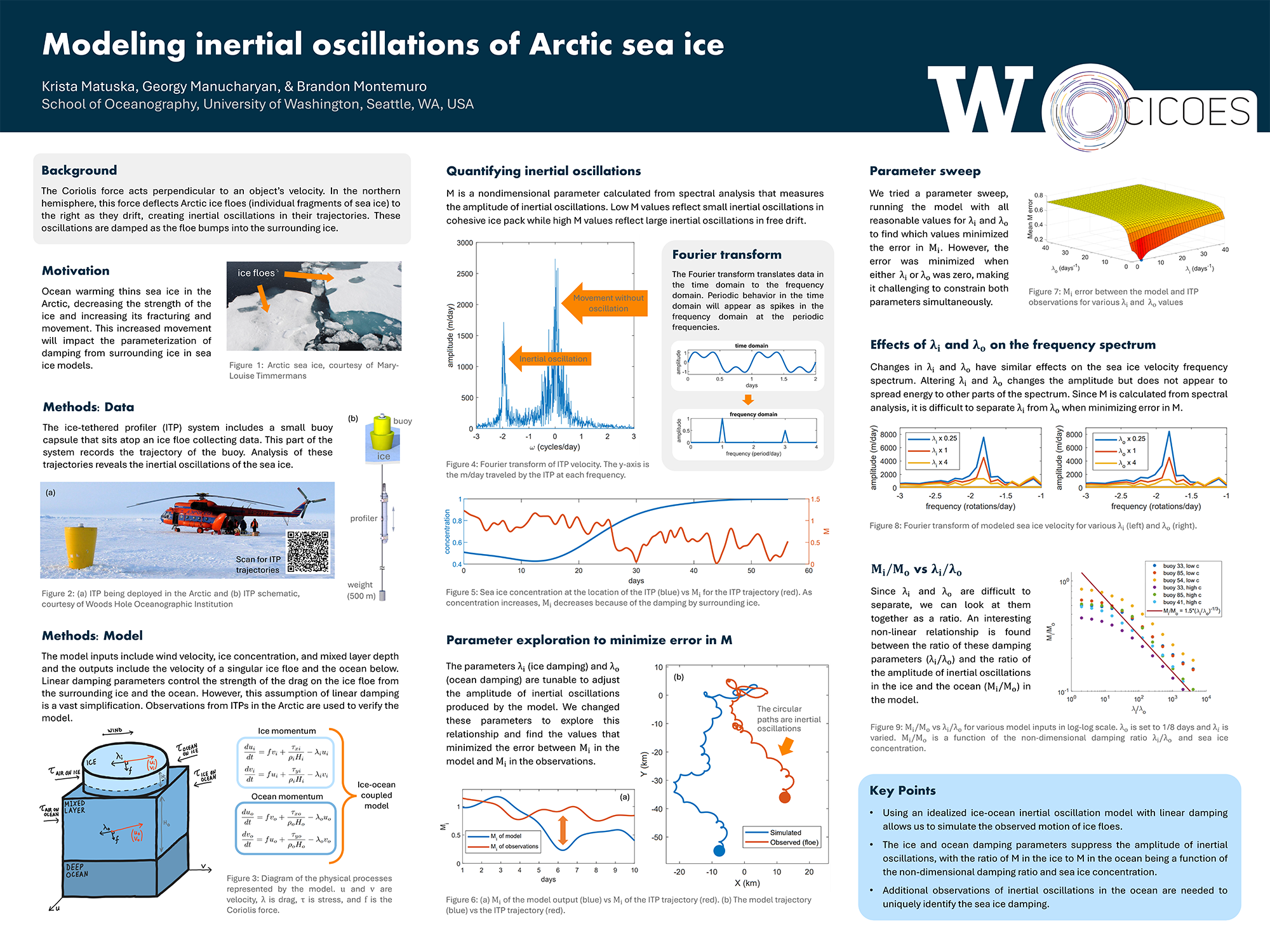 I’m Krista Matuska and I am studying Applied Math and Atmospheric Science at the University of Washington. This summer I worked with Georgy Manucharyan and Brandon Montemuro at the School of Oceanography on modeling the inertial oscillations of Arctic sea ice. When a floe (an individual sheet of sea ice) is pushed by a force, like the wind, its velocity is deflected to the right by the coriolis force. This deflection results in inertial oscillations in the floe’s trajectory, which are damped by the surrounding ice as well as the ocean. Ocean warming is reducing sea ice extent, thickness, and strength, causing it to fracture and move more. These changes affect the damping experienced by floes from the surrounding ice, which further impacts how this damping is parameterized in sea ice models. My project focused on using a simplified ice-ocean coupled model to simulate observed inertial oscillations and better understand how to parameterize the damping on floes from surrounding ice.