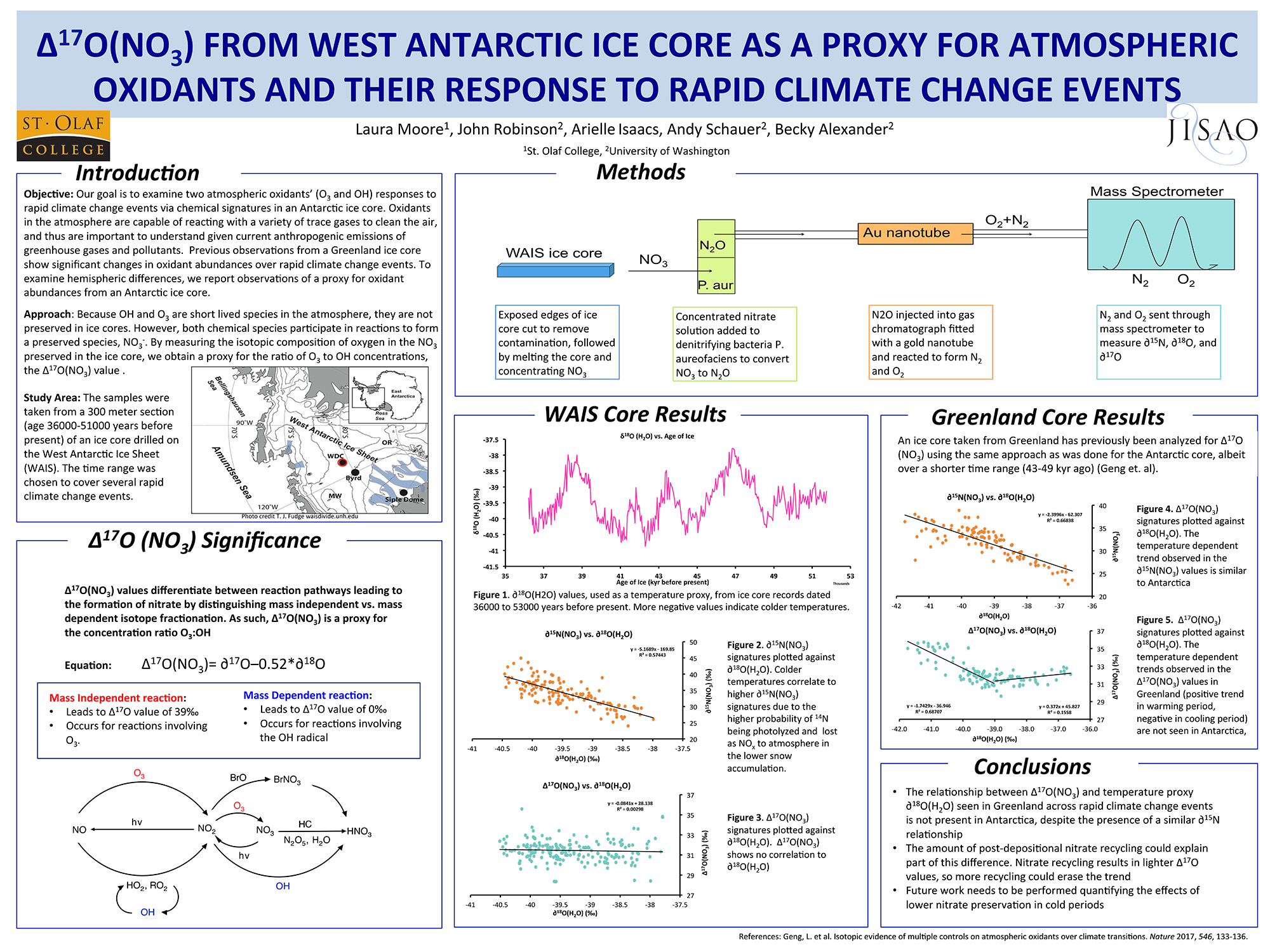 By the end of the summer, we found that unlike in Greenland, the ∆17O(NO3–) value does not exhibit temperature dependent behavior over rapid climate change events in the Antarctic core. The exact reason behind this hemispheric difference though, is uncertain at present.