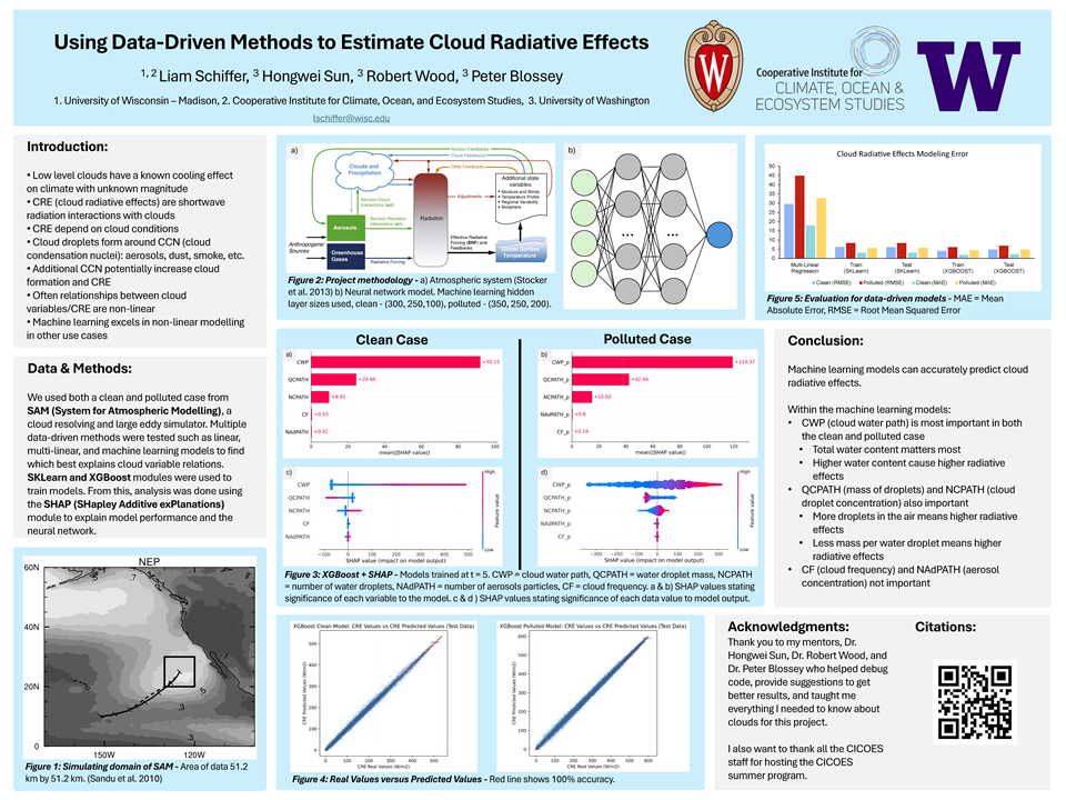 Hi, my name is Liam Schiffer. I am a rising junior at the University of Wisconsin-Madison studying atmospheric and oceanic sciences. During my time in the CICOES summer program, I worked with my mentor Hongwei Sun, and co-hosts Robert Wood and Peter Blossey. My project was focusing on data driven methods to learn more about the radiative effects of clouds.