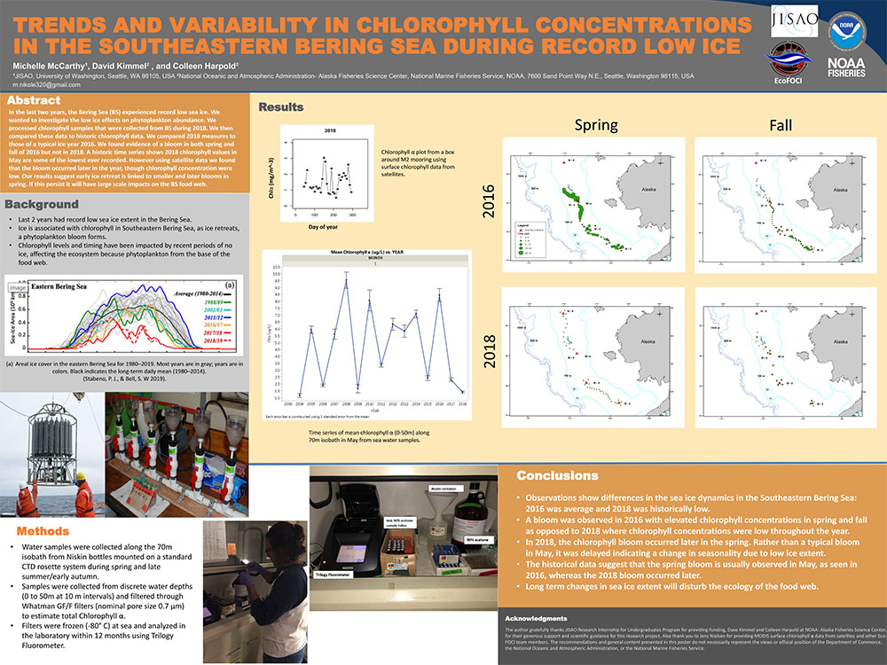 The research project I worked on with my mentors was to compile data from spring/fall 2018 cruise that collected chlorophyll samples in the Southeastern Bering Sea (BS). With those samples I developed a historic time series that showed the differences in concentrations of chlorophyll blooms. The focus of my project was to find and explain the trends that occurred from record low sea ice to chlorophyll values in 2016.