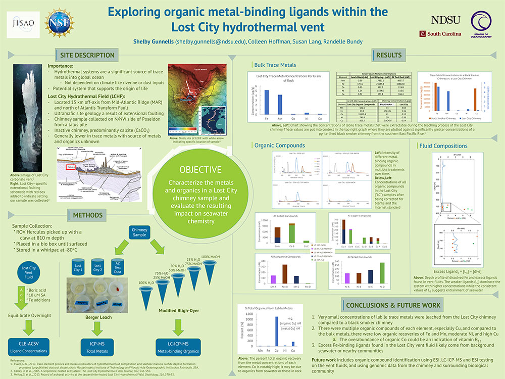 My name is Shelby Gunnells and I am a senior geology student at North Dakota State University. This past summer I worked with Dr. Colleen Hoffman in the Bundy lab on characterizing the metals and organics found within a chimney sample from the Lost City Hydrothermal Field.